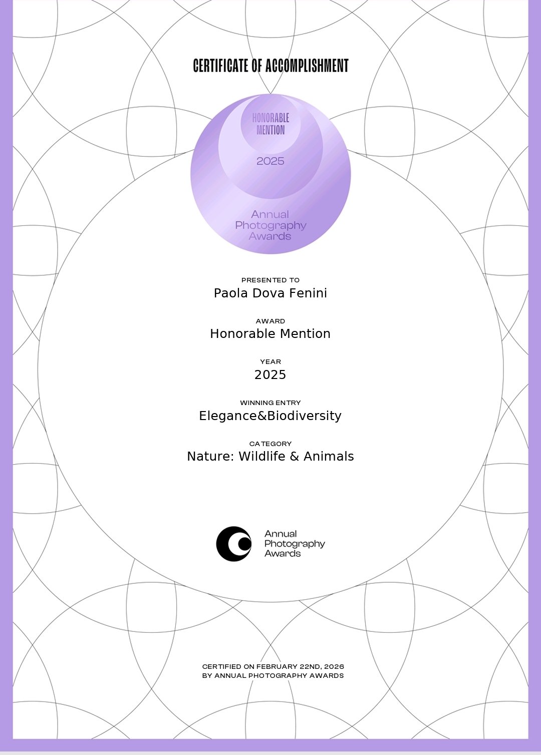 Il primo riconoscimento ufficiale arriva nel febbraio 2026, con una menzione d’onore dal Annual Photography Awards 2025, Elegance&Biodiversity, per una fotografia che ha un grandissimo valore sia artistico ma soprattutto di impatto emotivo, uno scatto ad uno dei miei rapaci preferiti il Grifone. (vedi in » scopri di più categoria uccelli).